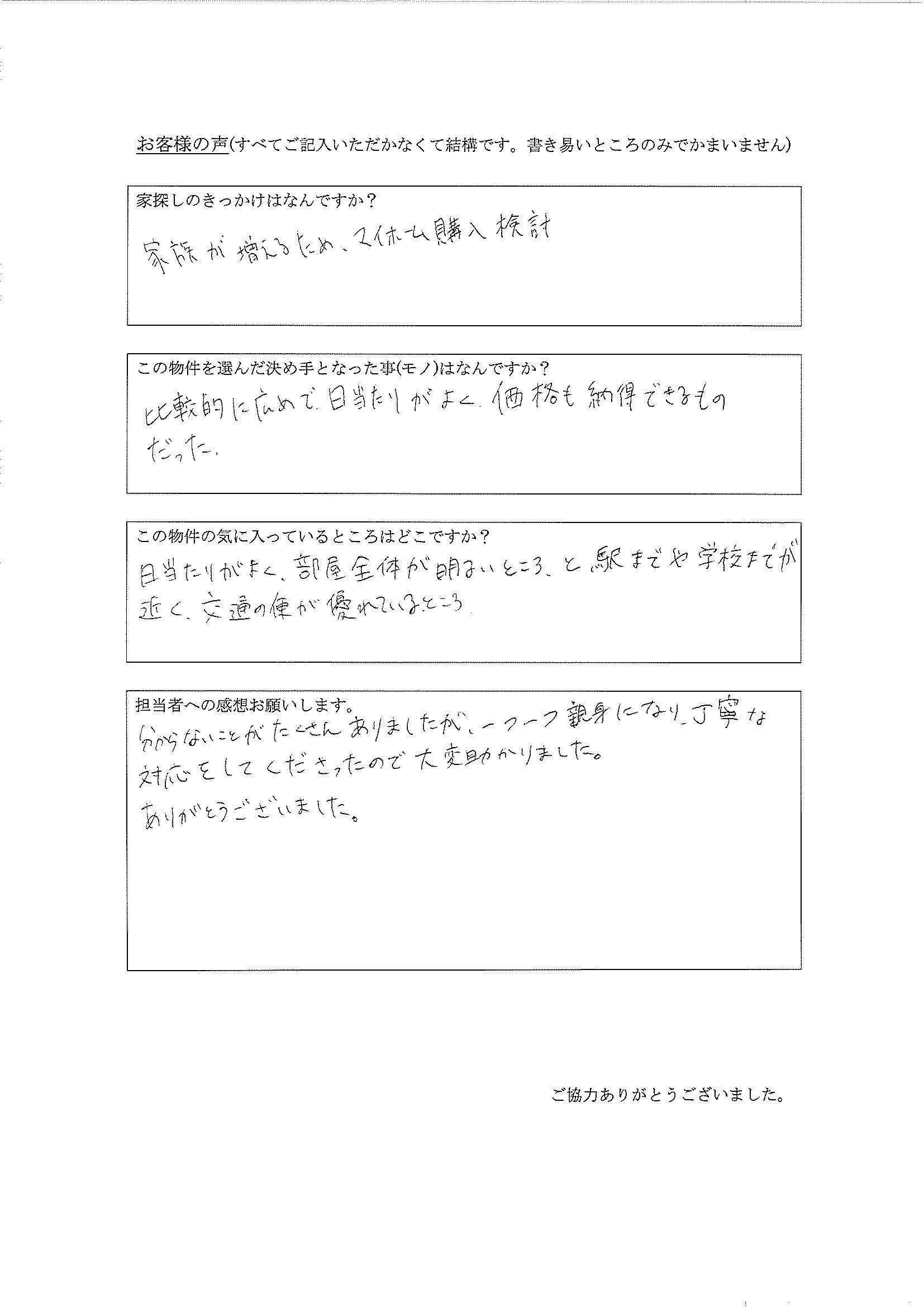 今回はどうもありがとうございました。欲しい物件が既に決まってらっしゃったので短い期間になってしまいましたね。何かありましたらまたいつでも呼んでください。
